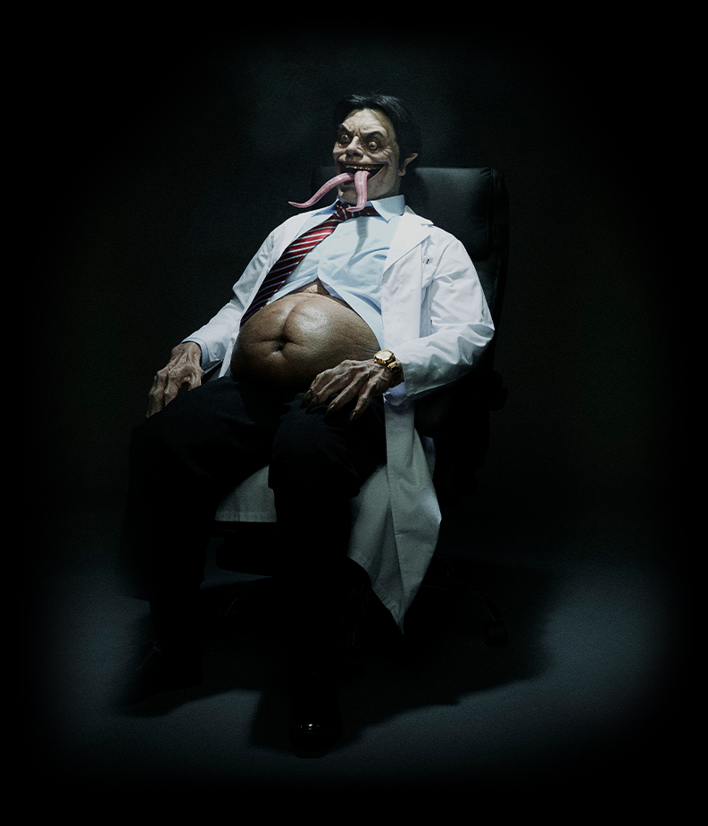 Dr.ビーストとは、患者を喰い物にする美容整形クリニックの醜さを擬人化した姿です。これらの特徴に注意し、慎重なクリニック選びを行なってください。